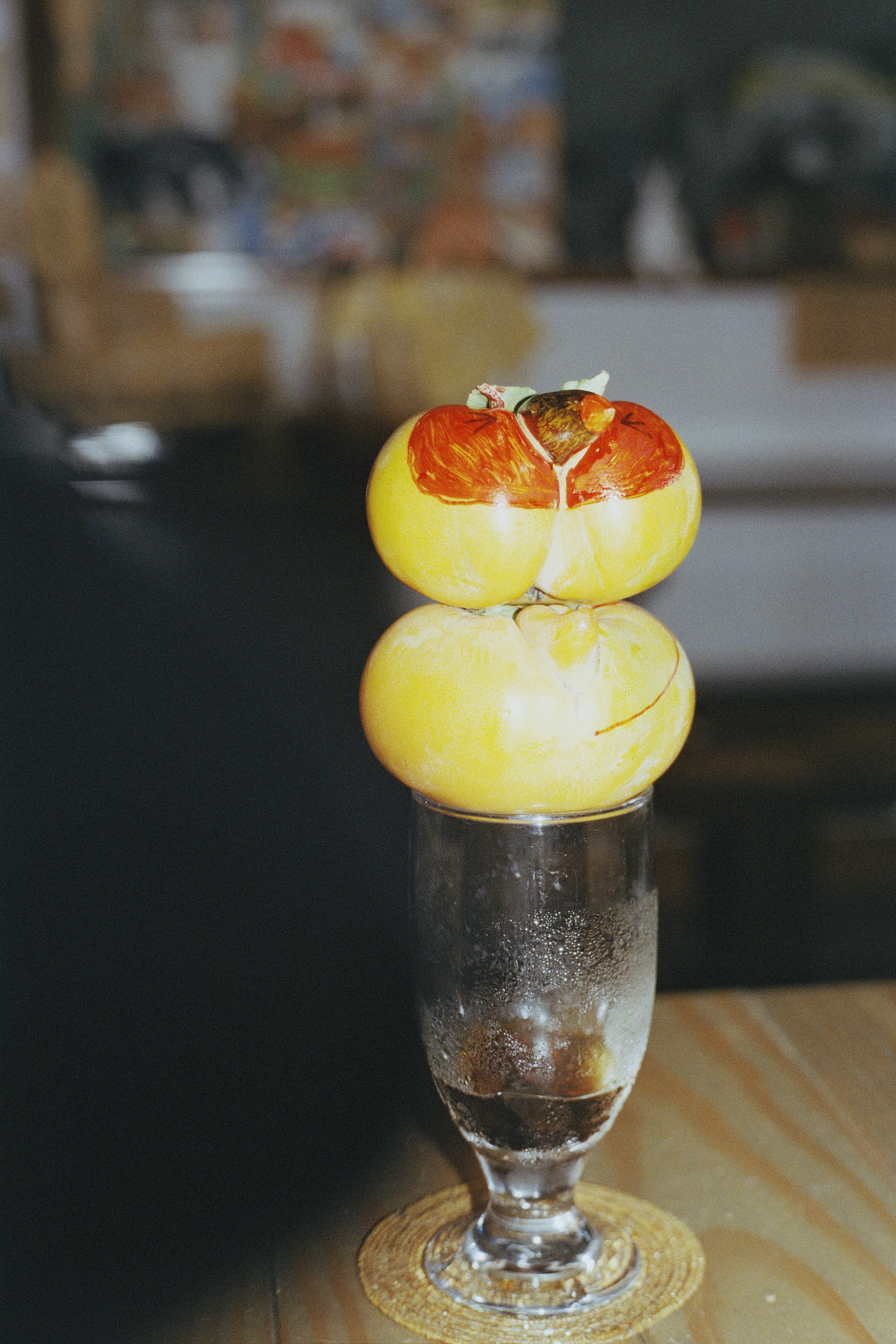 Then, on a cafe table, we found two persimmons stacked on a glass — painted by a local woman to resemble the toki, vermillion brushed across the skin, the green calyx left as a crest. The bird we had been chasing was there all along, wearing fruit as its disguise.